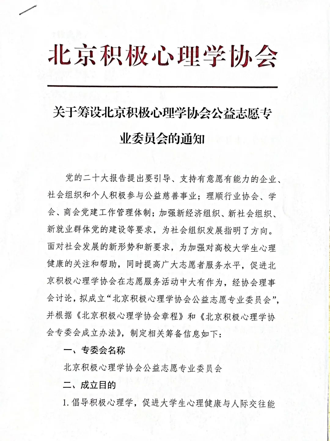 关于筹设北京积极心理学协会公益志愿专业委员会的通知